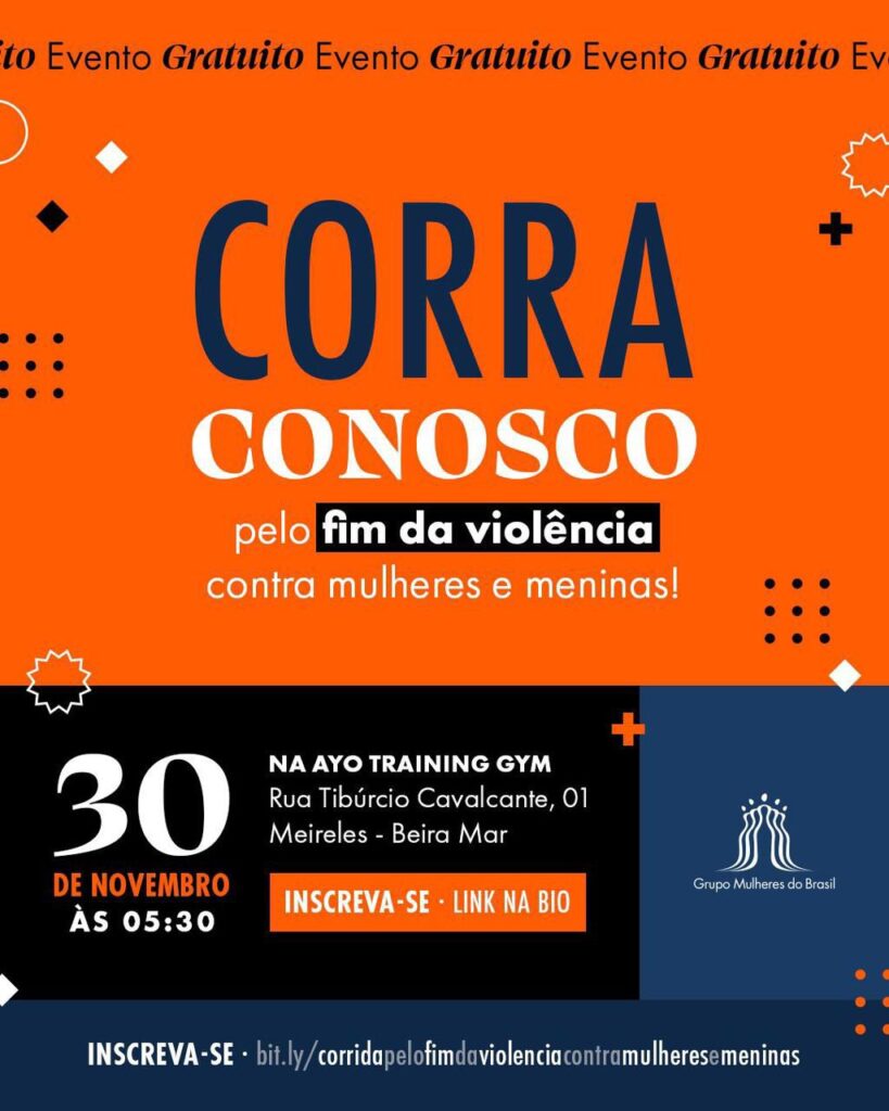 – 4º TREINO DE CORRIDA E CAMINHADA PELO FIM DA VIOLÊNCIA CONTRA A MULHERINFORMAÇÕES INICIAISLOCAL: Ayo Training Gym – Rua Tibúrcio Cavalcante, 01 – Meireles.HORÁRIO: 5h30.PERCURSOS: De acordo com a planilha. INFORMAÇÕES ADICIONAIS Apenas neste sábado não haverá tenda, apenas mesa e windbanner. BLUSAS DO EVENTO– Será entregue para as primeiras 500 pessoas INSCRITAS que